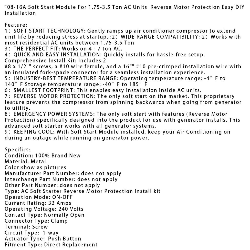 1:SOFT START TECHNOLOGY: Gently ramps up air conditioner compressor to extend unit life by reducing stress at startup. :2:WIDE RANGE COMPATIBILITY: 2:Works with most residential AC units between 1.75-3.5 Ton