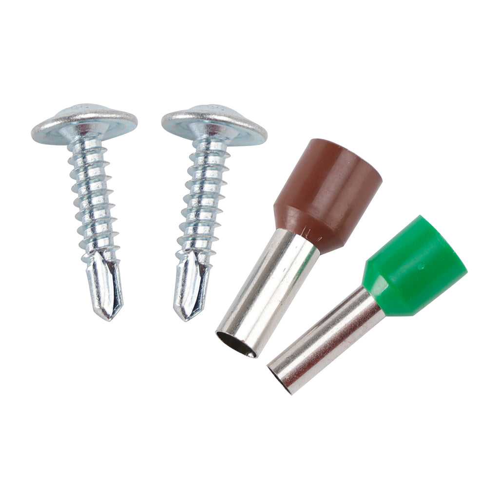 #8 x 1/2" screws, a #10 wire ferrule, and a 16" #10 pre-crimped installation wire with an insulated fork-spade connector for a seamless installation experience.