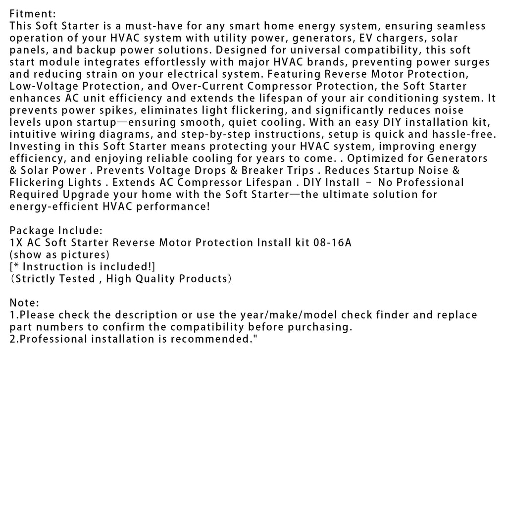 This Soft Starter is a must-have for any smart home energy system, ensuring seamless operation of your HVAC system with utility power, generators, EV chargers, solar panels, and backup power solutions. Designed for universal compatibility, this soft start module integrates effortlessly with major HVAC brands, preventing power surges and reducing strain on your electrical system. Featuring Reverse Motor Protection, Low-Voltage Protection, and Over-Current Compressor Protection, the Soft Starter enhances AC unit efficiency and extends the lifespan of your air conditioning system. It prevents power spikes, eliminates light flickering, and significantly reduces noise levels upon startup—ensuring smooth, quiet cooling. With an easy DIY installation kit, intuitive wiring diagrams, and step-by-step instructions, setup is quick and hassle-free. Investing in this Soft Starter means protecting your HVAC system, improving energy efficiency, and enjoying reliable cooling for years to come. . Optimized for Generators & Solar Power . Prevents Voltage Drops & Breaker Trips . Reduces Startup Noise & Flickering Lights . Extends AC Compressor Lifespan . DIY Install – No Professional Required Upgrade your home with the Soft Starter—the ultimate solution for energy-efficient HVAC performance!