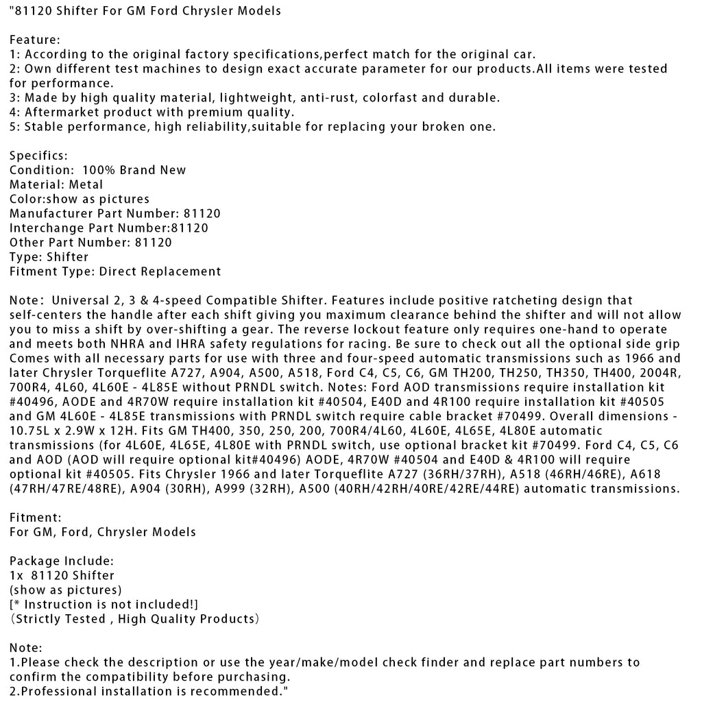Note:Universal 2, 3 & 4-speed Compatible Shifter. Features include positive ratcheting design that self-centers the handle after each shift giving you maximum clearance behind the shifter and will not allow you to miss a shift by over-shifting a gear. The reverse lockout feature only requires one-hand to operate and meets both NHRA and IHRA safety regulations for racing. Be sure to check out all the optional side grip Comes with all necessary parts for use with three and four-speed automatic transmissions such as 1966 and later Chrysler Torqueflite A727, A904, A500, A518, Ford C4, C5, C6, GM TH200, TH250, TH350, TH400, 2004R, 700R4, 4L60, 4L60E - 4L85E without PRNDL switch. Notes: Ford AOD transmissions require installation kit #40496, AODE and 4R70W require installation kit #40504, E40D and 4R100 require installation kit #40505 and GM 4L60E - 4L85E transmissions with PRNDL switch require cable bracket #70499. Overall dimensions - 10.75L x 2.9W x 12H. Fits GM TH400, 350, 250, 200, 700R4/4L60, 4L60E, 4L65E, 4L80E automatic transmissions (for 4L60E, 4L65E, 4L80E with PRNDL switch, use optional bracket kit #70499. Ford C4, C5, C6 and AOD (AOD will require optional kit#40496) AODE, 4R70W #40504 and E40D & 4R100 will require optional kit #40505. Fits Chrysler 1966 and later Torqueflite A727 (36RH/37RH), A518 (46RH/46RE), A618 (47RH/47RE/48RE), A904 (30RH), A999 (32RH), A500 (40RH/42RH/40RE/42RE/44RE) automatic transmissions.