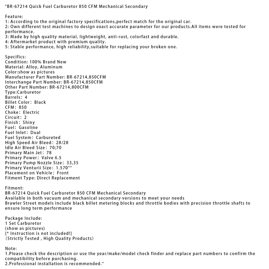 BR-67214 Quick Fuel Carburetor 850 CFM Mechanical Secondary