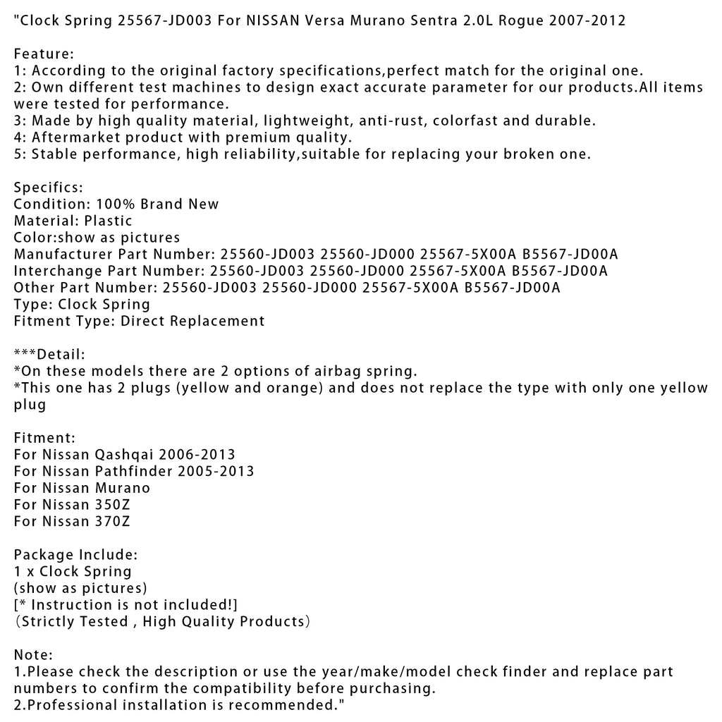 Clock Spring 25567-JD003 For NISSAN Versa Murano Sentra 2.0L Rogue 2007-2012