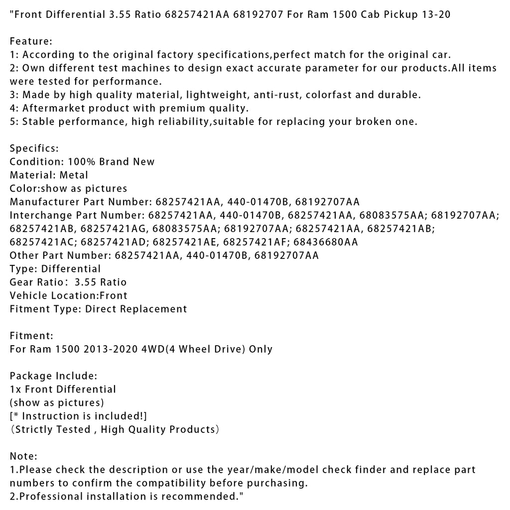Front Differential 3.55 Ratio 68257421AA 68192707 For Ram 1500 Cab Pickup 2013-2020