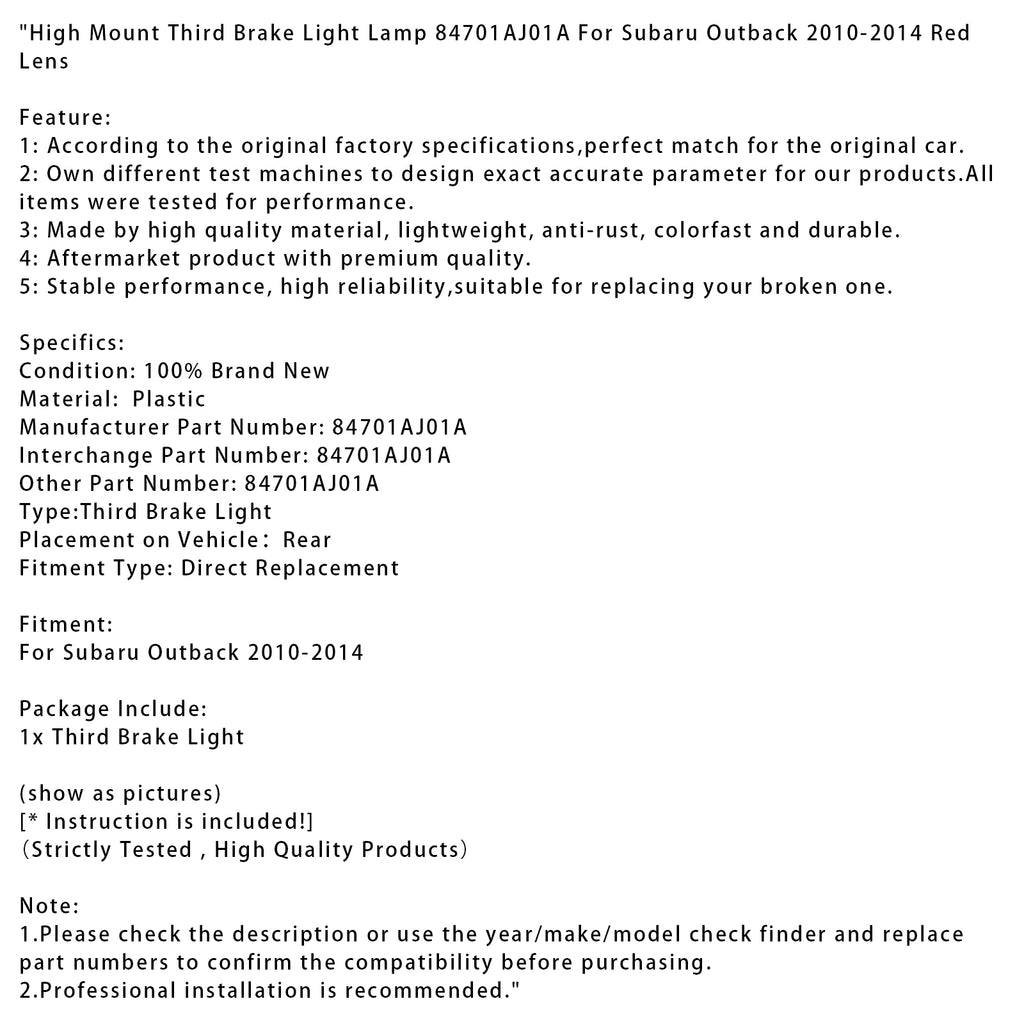High Mount Third Brake Light Lamp 84701AJ01A For Subaru Outback 2010-2014 Red Lens