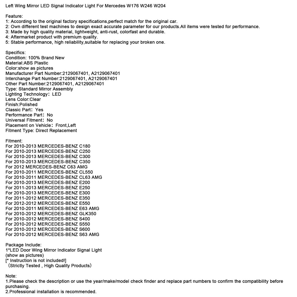 Left Wing Mirror LED Signal Indicator Light For Mercedes W176 W246 W204