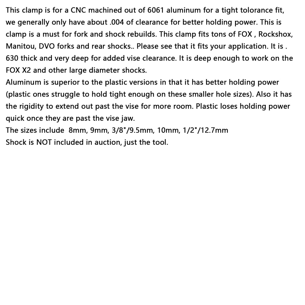 This clamp is for a CNC machined out of 6061 aluminum for a tight tolorance fit, we generally only have about .004 of clearance for better holding power. This is clamp is a must for fork and shock rebuilds. This clamp fits tons of FOX , Rockshox, Manitou, DVO forks and rear shocks.. Please see that it fits your application. It is .630 thick and very deep for added vise clearance. It is deep enough to work on the FOX X2 and other large diameter shocks.