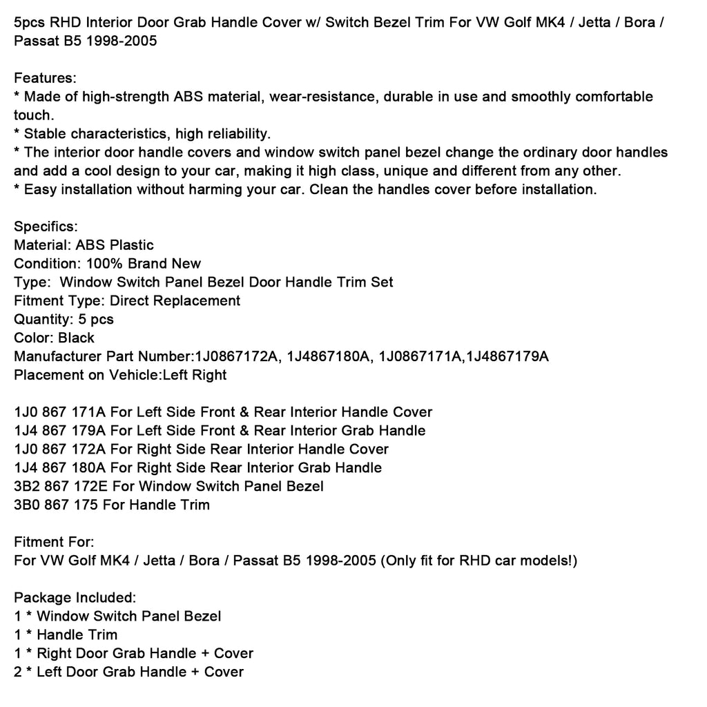 5pcs RHD Interior Door Grab Handle Cover w/ Switch Bezel Trim For VW Golf MK4 / Jetta / Bora / Passat B5 1998-2005