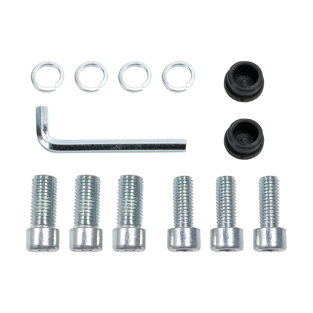 Included 2x right-hand M8x30 bolts, 2x Right-hand M10x30 bolts, 1x left-hand M10x30 bolt, 1x right-hand M8x30 bolt, collars and mirror hole caps.