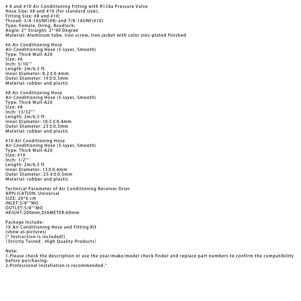 3.Item Inludes: 1 PC #6 AC Hose, 1 PC #8 AC Hose, 1 PC #10 AC Hose, 3 PCS #6 AC Fittings(Straight), 3 PCS #6 AC Fittings(90 Degree), 3 PCS #8 AC Fittings(Straight), 3 PCS #8 AC Fittings(90 Degree), 3 PCS #10 AC Fittings(Straight), 3 PCS #10 AC Fittings(90 Degree), 1 PC #8 AC Fitting with R134a Valve(Straight), 1 PC #10 AC Fitting with R134a Valve(Straight), 1 PC #8 AC Fitting with R134a Valve(90 Degree), 1 PC #10 AC Fitting with R134a Valve(90 Degree), 1PC AC Receiver Drier, 4 PCS Oring Seals for #6 Fitting(6.8*19mm), 4 PCS Oring Seals for #8 Fitting(10.8×2.4mm), 4 PCS Oring Seals for #10 Fitting(13.8×2.4mm)
