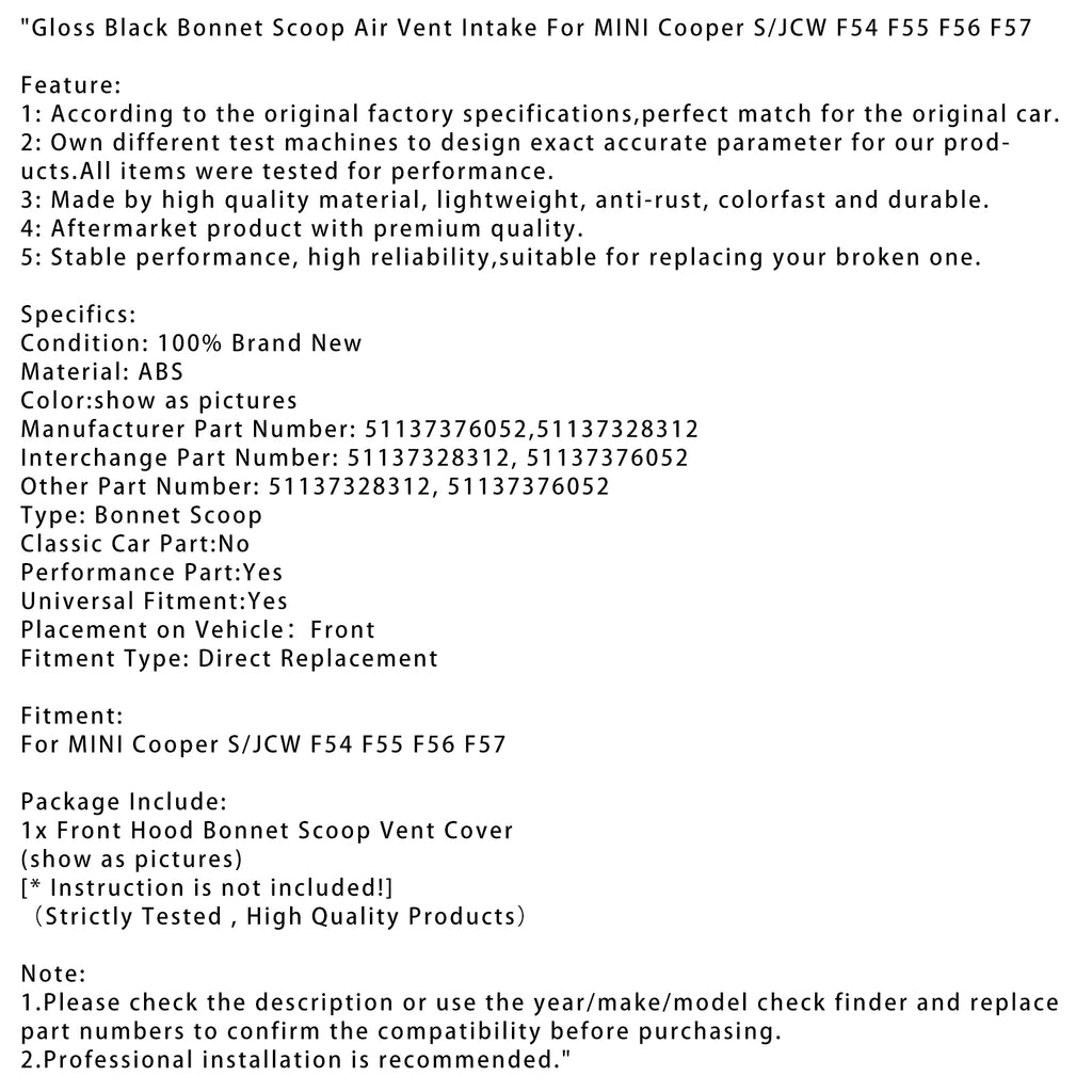 Gloss Black Bonnet Scoop Air Vent Intake For MINI Cooper S/JCW F54 F55 F56 F57