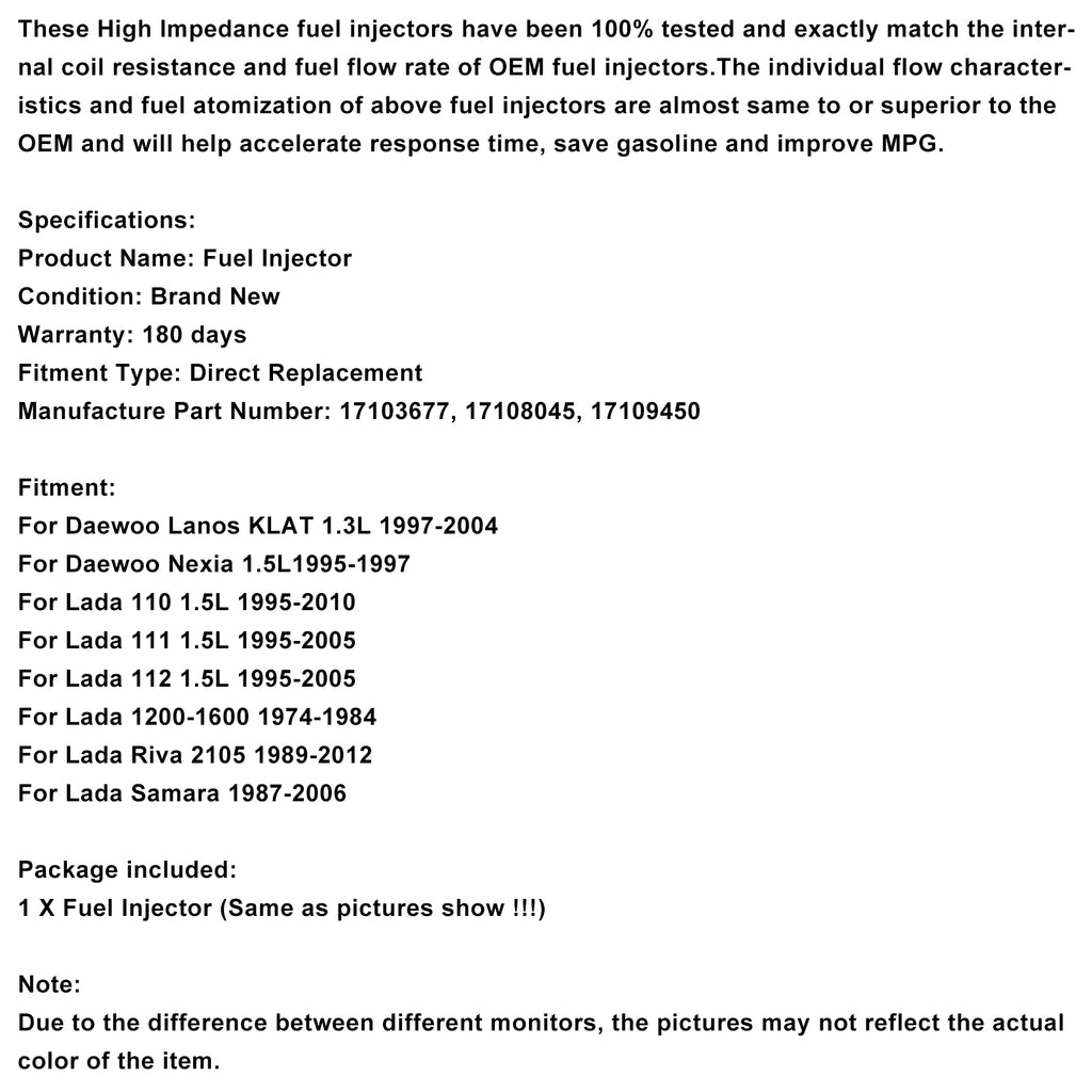 Estos inyectores de combustible de alta impedancia han sido 100% probados y coinciden exactamente con la resistencia de la bobina interna y el caudal de combustible del combustible OEM. injectors.The Las características de flujo individuales y la atomización de combustible de los inyectores de combustible anteriores son casi iguales o superiores a las del OEM y ayudarán a acelerar el tiempo de respuesta, ahorrar gasolina y mejorar el MPG.