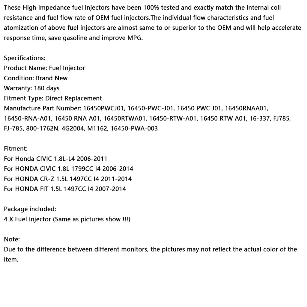 Estos inyectores de combustible de alta impedancia han sido 100% probados y coinciden exactamente con la resistencia de la bobina interna y el caudal de combustible del combustible OEM. injectors.The Las características de flujo individuales y la atomización de combustible de los inyectores de combustible anteriores son casi iguales o superiores a las del OEM y ayudarán a acelerar el tiempo de respuesta, ahorrar gasolina y mejorar el MPG.
