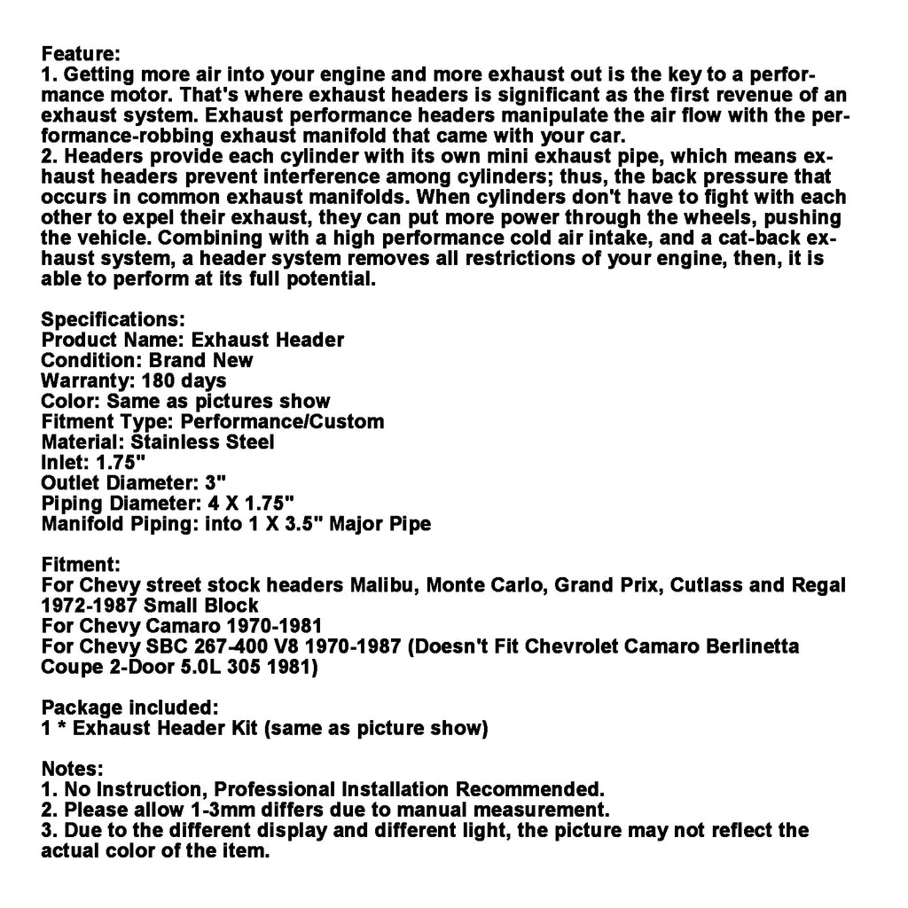 Para colectores de serie de calle Chevy Malibu, Monte Carlo, Grand Prix, Cutlass y Regal 1972-1987 Bloque pequeño