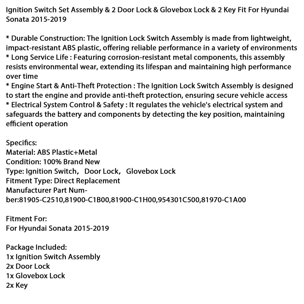 Conjunto de interruptor de encendido &Cerradura de 2 puertas &cerradura de la guantera &2 llaves compatibles con Hyundai Sonata 2015-2019