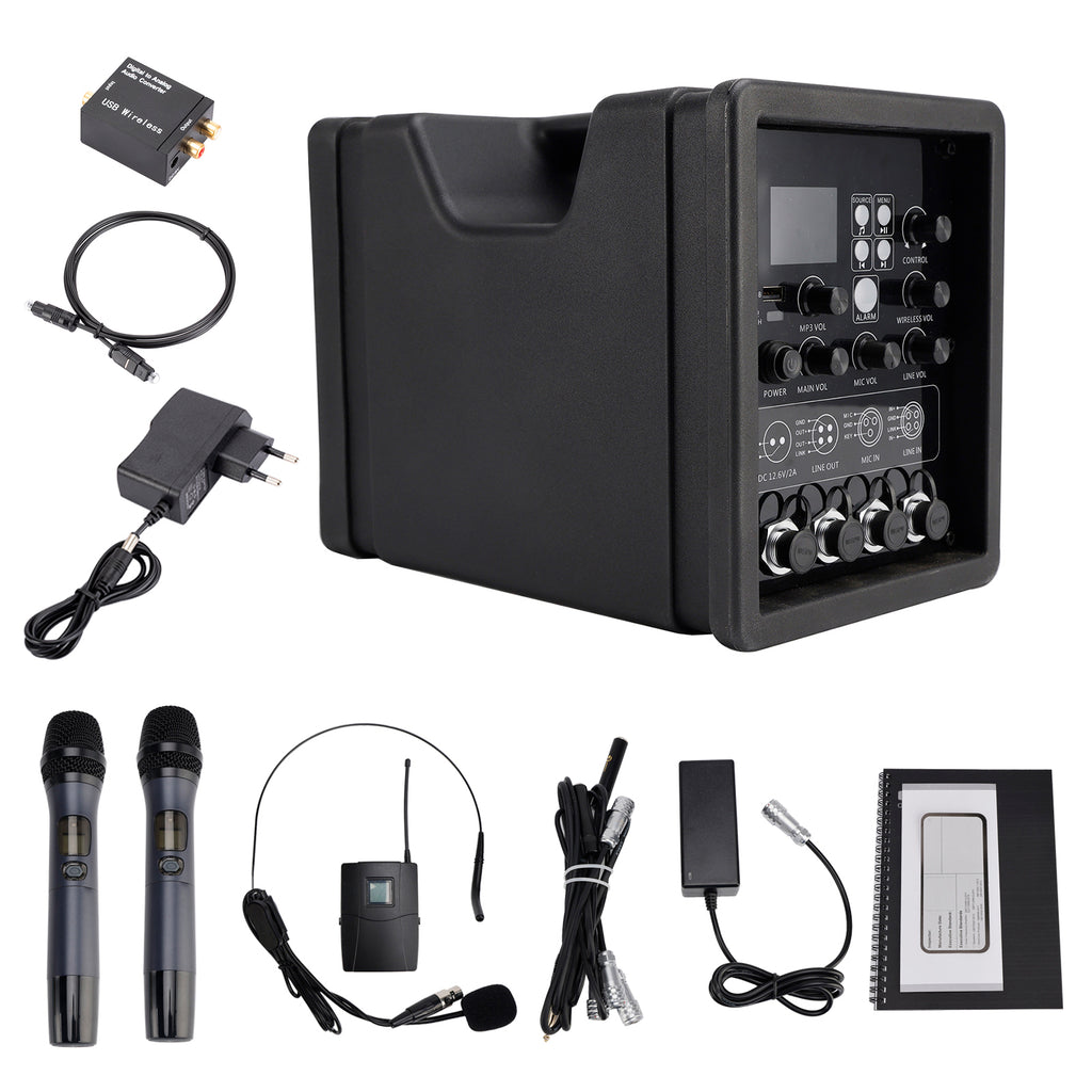 13. Cuenta con un receptor FM, micrófono inalámbrico, grabador y reproductor de MP3, entrada de audio externa USB y una entrada de micrófono con cable.