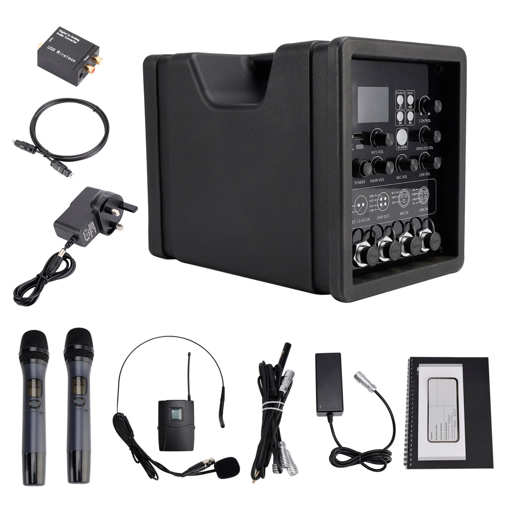 13. Cuenta con un receptor FM, micrófono inalámbrico, grabador y reproductor de MP3, entrada de audio externa USB y una entrada de micrófono con cable.