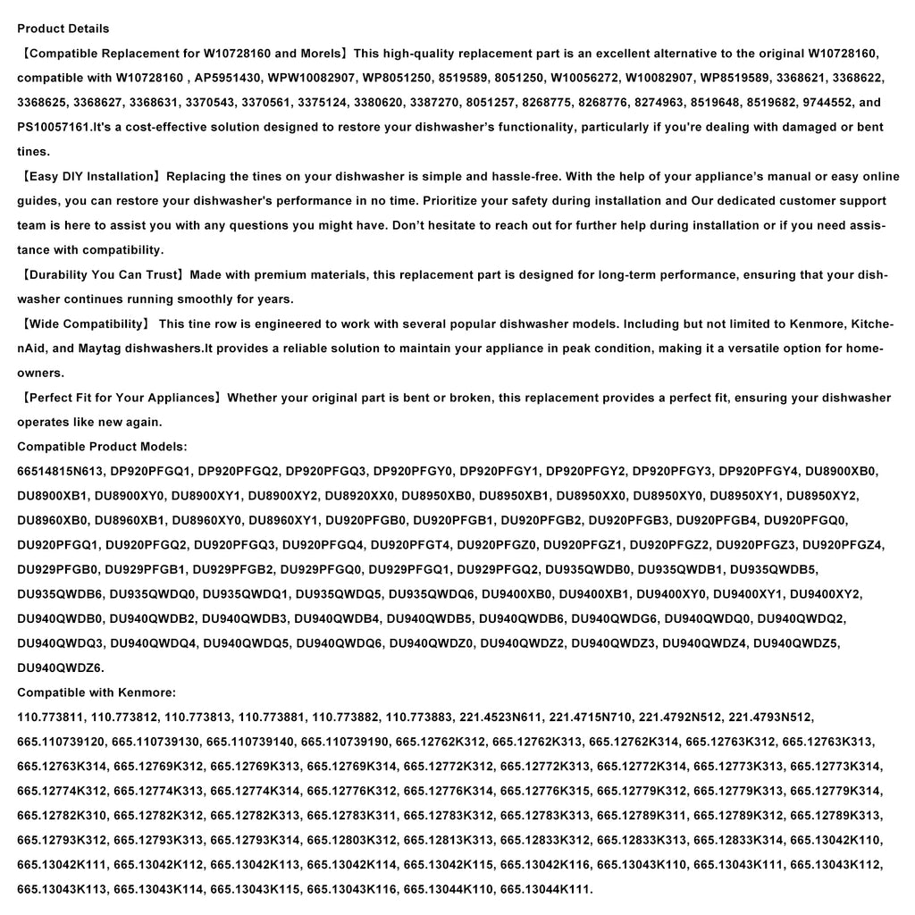 【Amplia compatibilidad】 Esta hilera de púas está diseñada para funcionar con varios modelos de lavavajillas populares, como Kenmore, KitchenAid y Maytag, entre otros. dishwashers.It Proporciona una solución confiable para mantener su electrodoméstico en óptimas condiciones, lo que lo convierte en una opción versátil para los propietarios de viviendas.
