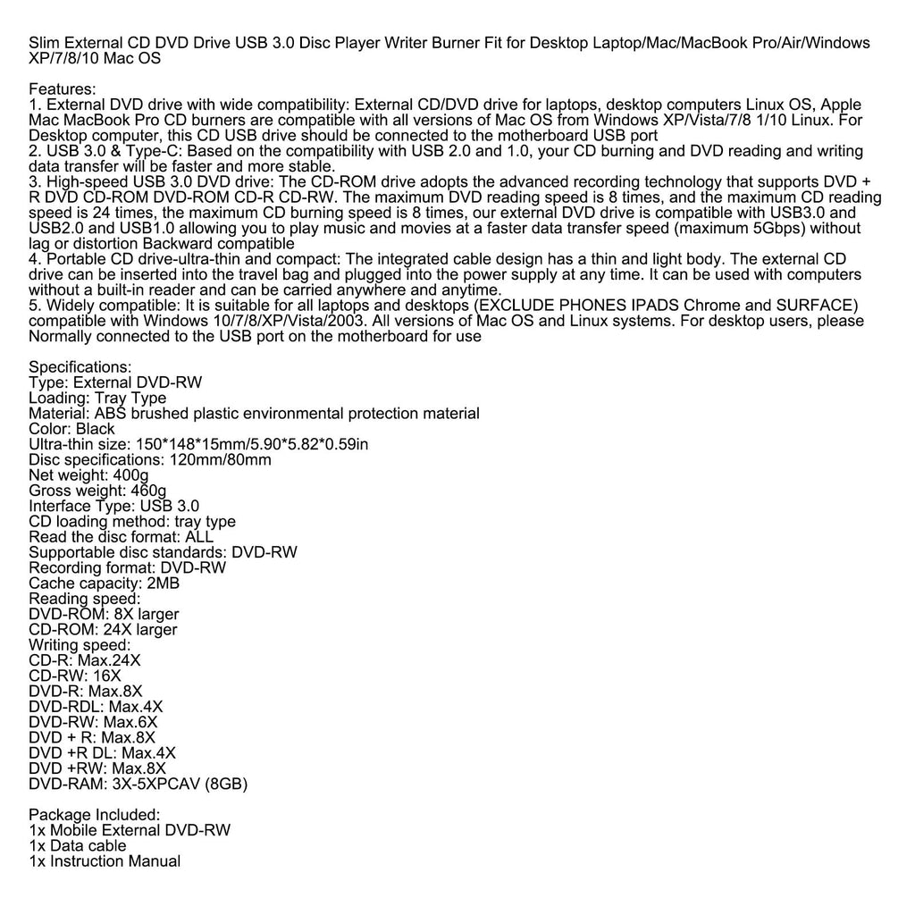3. Unidad de DVD USB 3.0 de alta velocidad: La unidad de CD-ROM utiliza tecnología de grabación avanzada compatible con DVD+R, DVD CD-ROM, DVD-ROM CD-R CD-RW. La velocidad máxima de lectura de DVD es 8 veces mayor, la de lectura de CD es 24 veces mayor y la de grabación de CD es 8 veces mayor. Nuestra unidad de DVD externa es compatible con USB 3.0, USB 2.0 y USB 1.0, lo que le permite reproducir música y películas a una velocidad de transferencia de datos más rápida (máximo 5 Gbps) sin retardo ni distorsión. Compatible con versiones anteriores.