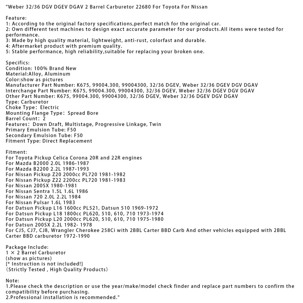 Carburateur Weber 32/36 DGV DGEV DGAV 2 barils 22680 pour Toyota pour Nissan