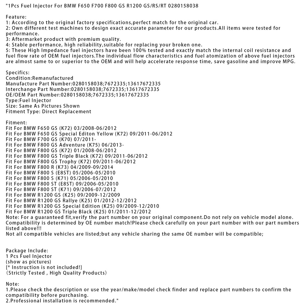 1Pcs Fuel Injector For BMW F650 F700 F800 GS R1200 GS/RS/RT 0280158038