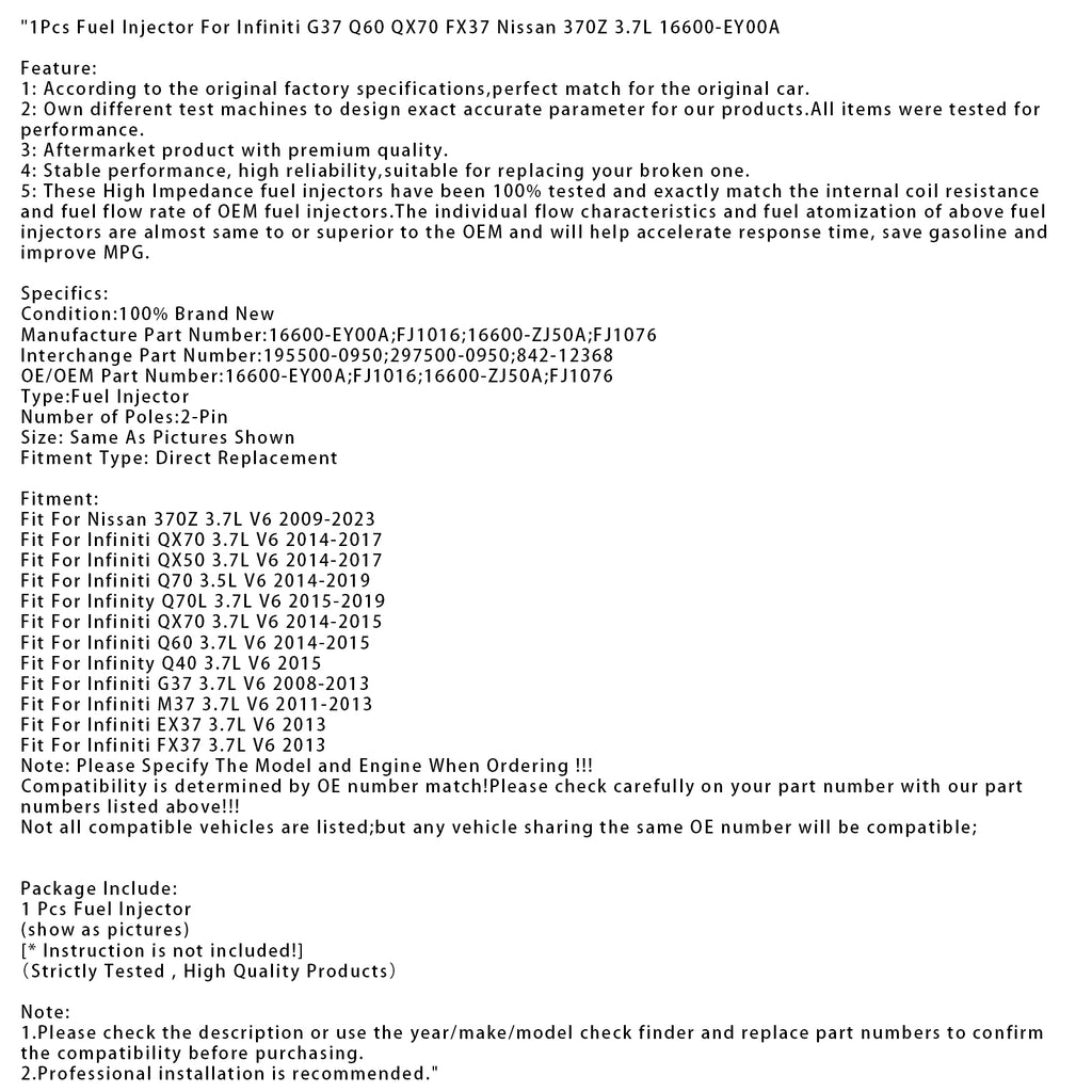 1Pcs Fuel Injector For Infiniti G37 Q60 QX70 FX37 Nissan 370Z 3.7L 16600-EY00A