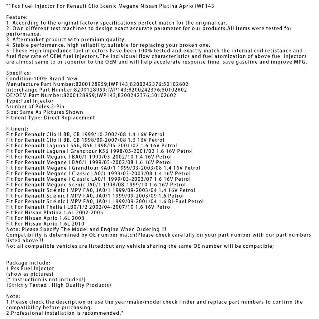 1Pcs Fuel Injector For Renault Clio Scenic Megane Nissan Platina Aprio IWP143