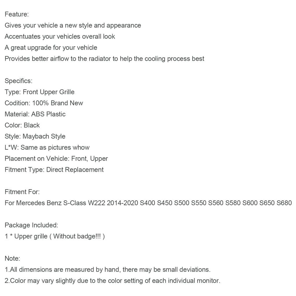 Calandre avant adaptée à la Mercedes-Benz Classe S W222 S500 S550 S600 2014-2020 avec accessoires