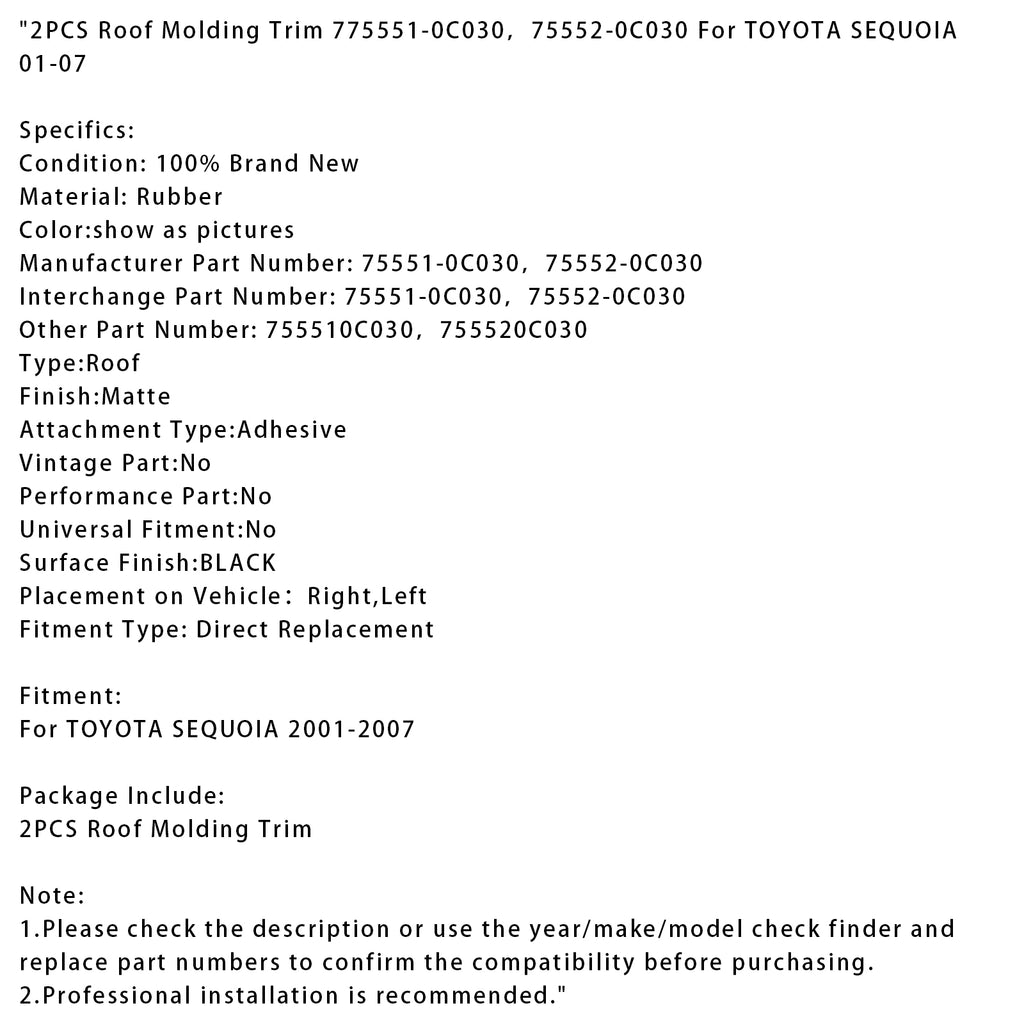 Lot de 2 moulures de toit 775551-0C030, 75552-0C030 pour Toyota Sequoia 2001-2007