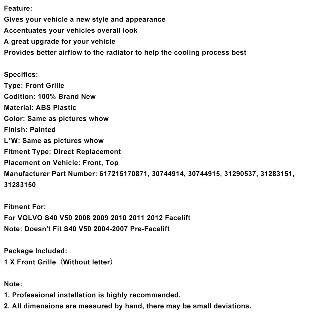 Grille de calandre en nid d'abeille pour pare-chocs avant, compatible avec Volvo S40 V50, noir brillant (2008-2012)