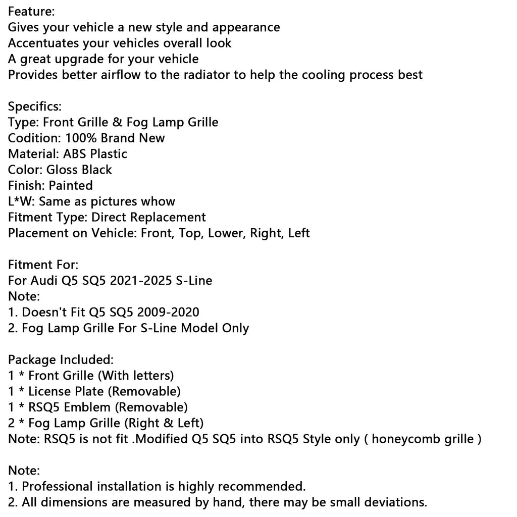 Remarque : le RSQ5 n'est pas compatible. Le Q5 SQ5 modifié est uniquement compatible avec le style RSQ5 (calandre en nid d'abeille).