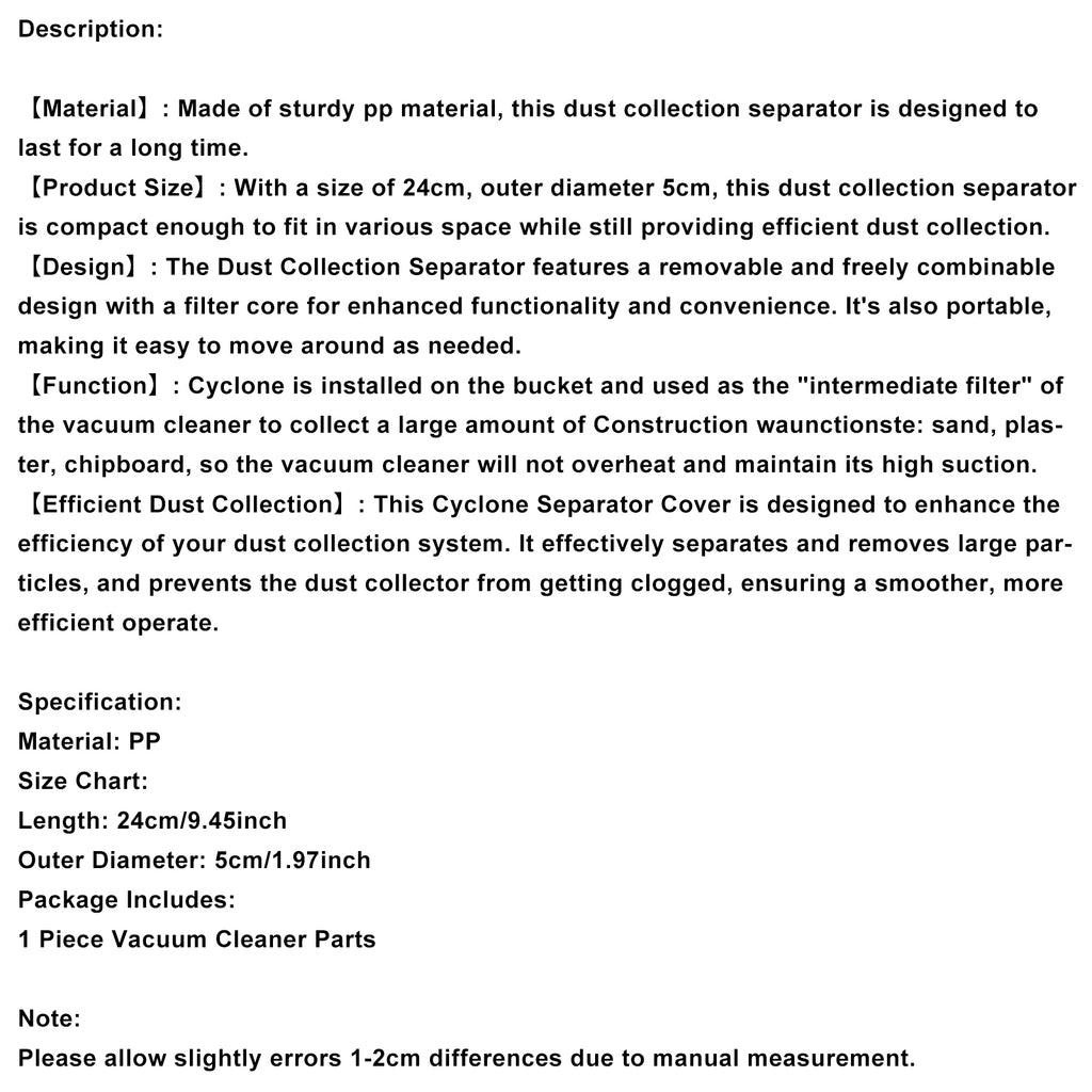 【Taille du produit】: Avec une taille de 24 cm, un diamètre extérieur de 5 cm, ce séparateur de dépoussiérage est suffisamment compact pour s'adapter à divers espaces tout en offrant une collecte efficace de la poussière.