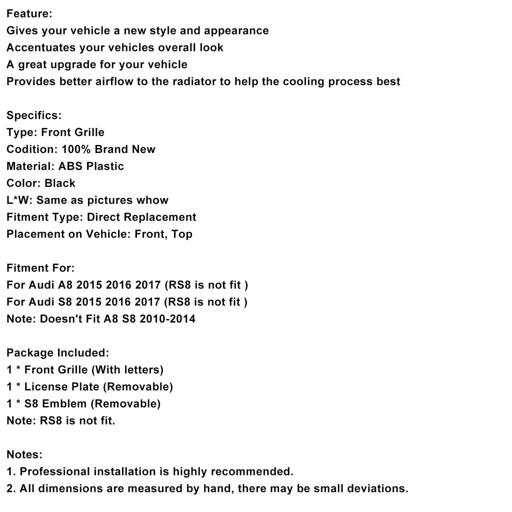Grille de pare-chocs avant style S8, compatible avec Audi A8 S8 2015-2017, noire