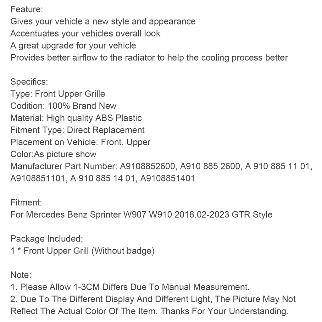 Grille de pare-chocs avant adaptée au Mercedes Sprinter W907 W910 Style GT 2018-2023
