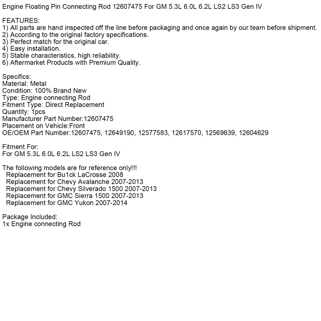 Bielle à axe flottant pour moteur GM 5,3 L, 6,0 L, 6,2 L LS2, LS3 Gen IV (12607475)