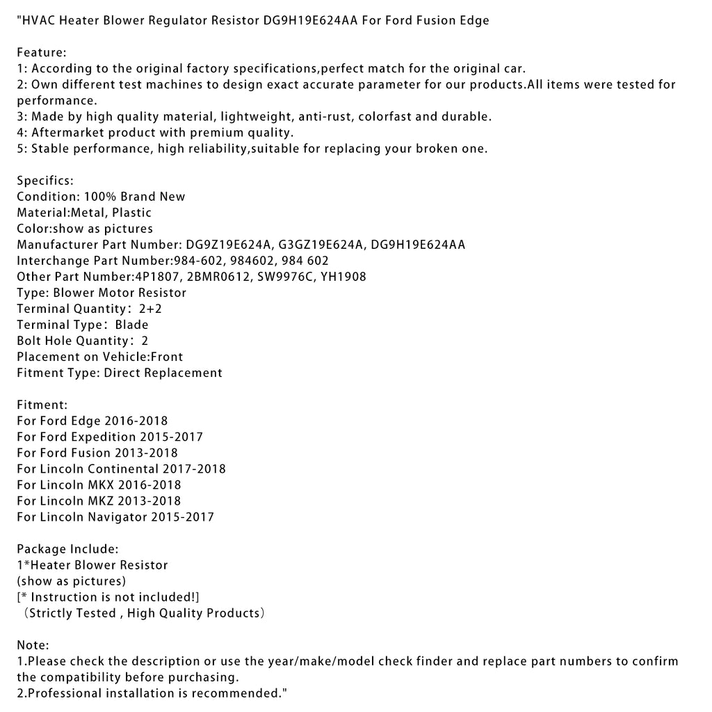 Résistance de régulation de ventilateur de chauffage CVC DG9H19E624AA pour Ford Fusion Edge
