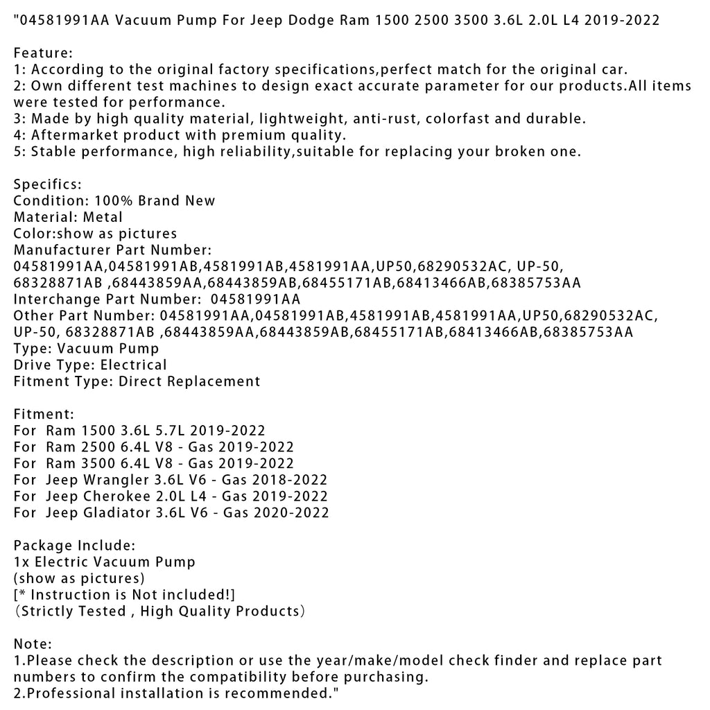 04581991AA Vacuum Pump Fit For Jeep Dodge Ram 1500 2500 3500 3.6L 2.0L L4 2019-2022
