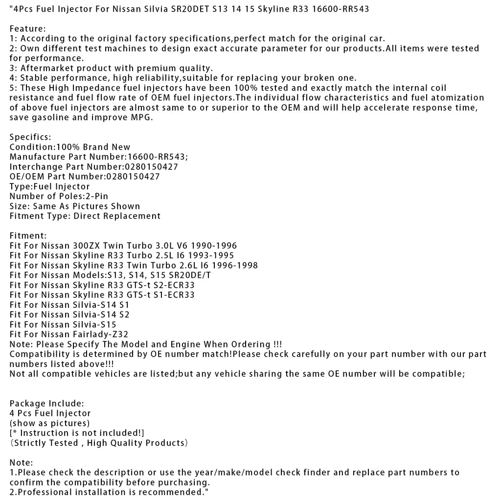 4Pcs Fuel Injector For Nissan Silvia SR20DET S13 14 15 Skyline R33 16600-RR543
