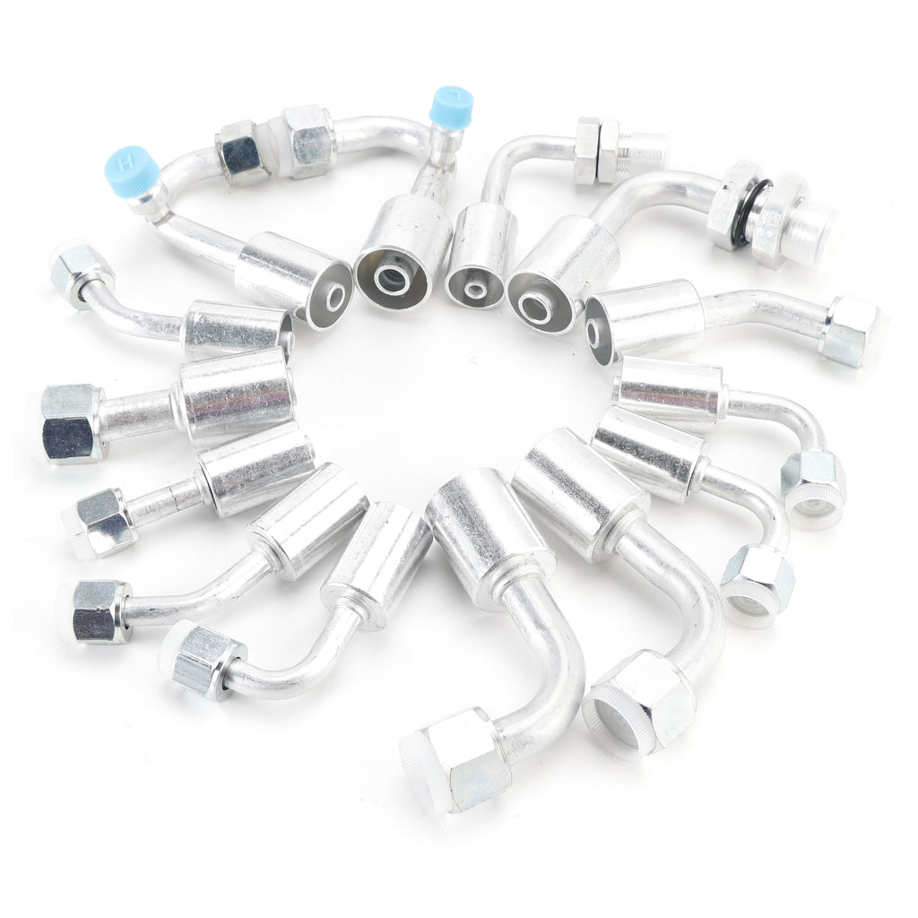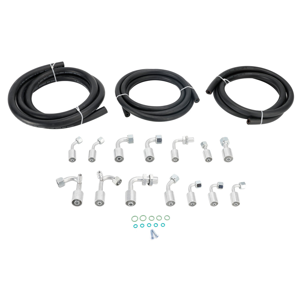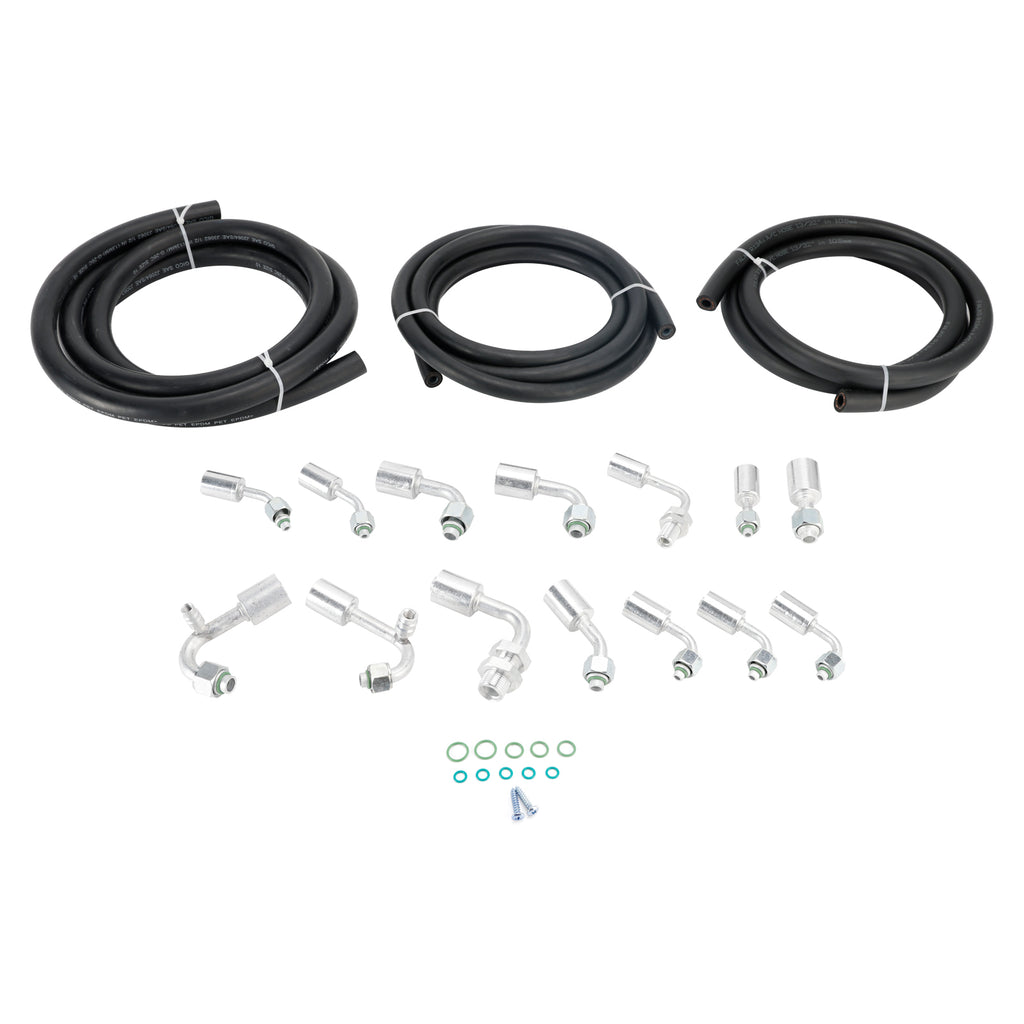 This universal ac kit contains multiple lengths of hoses, various sizes of fittings, and multiple sizes of O-rings, which can be adapted to the needs of different vehicle models and air conditioning systems.
