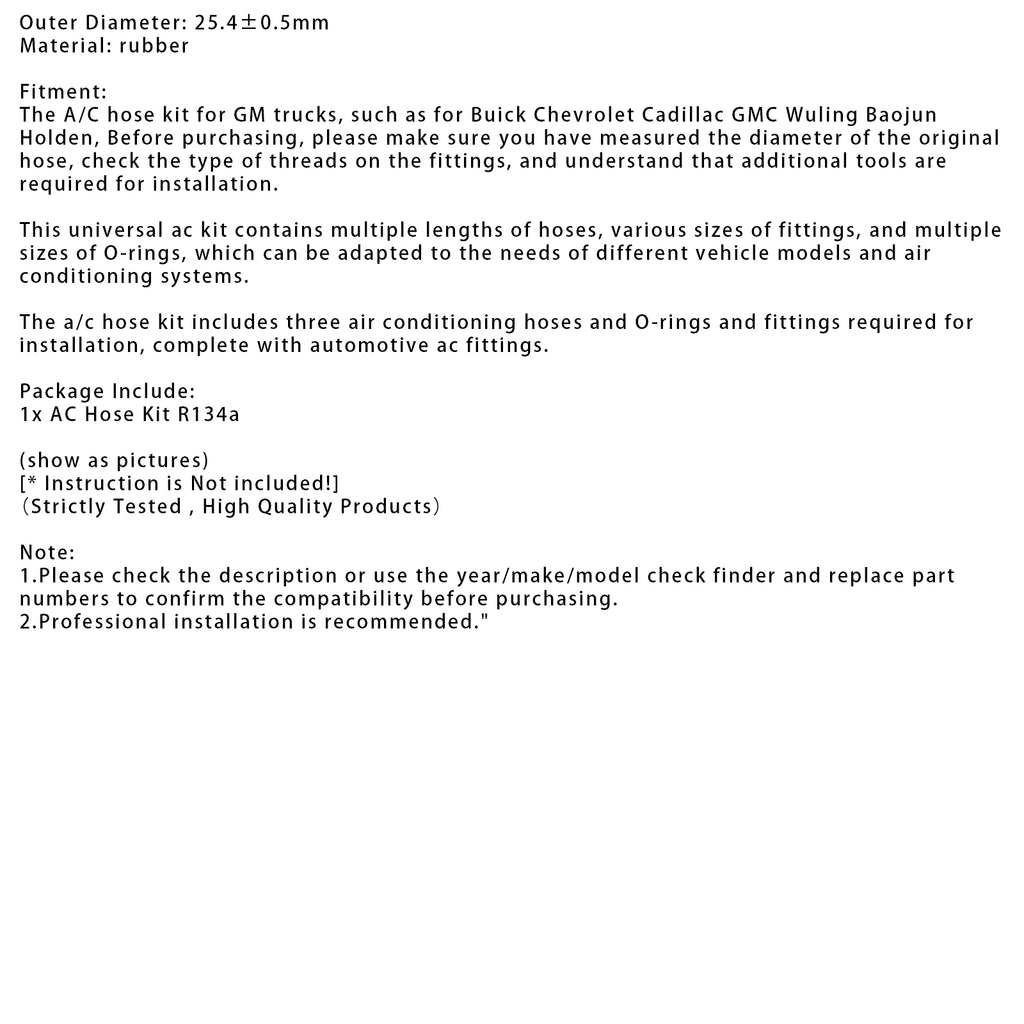 The A/C hose kit for GM trucks, such as for Buick Chevrolet Cadillac GMC Wuling Baojun Holden, Before purchasing, please make sure you have measured the diameter of the original hose, check the type of threads on the fittings, and understand that additional tools are required for installation.