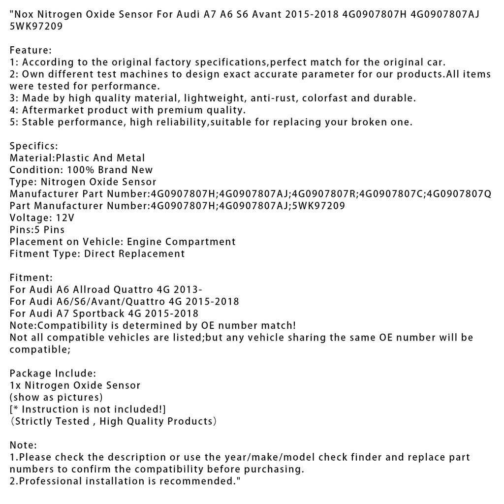 Capteur d'oxyde d'azote NOX pour Audi A7 A6 S6 Avant 2015-2018 4G0907807H 4G0907807AJ 5WK97209