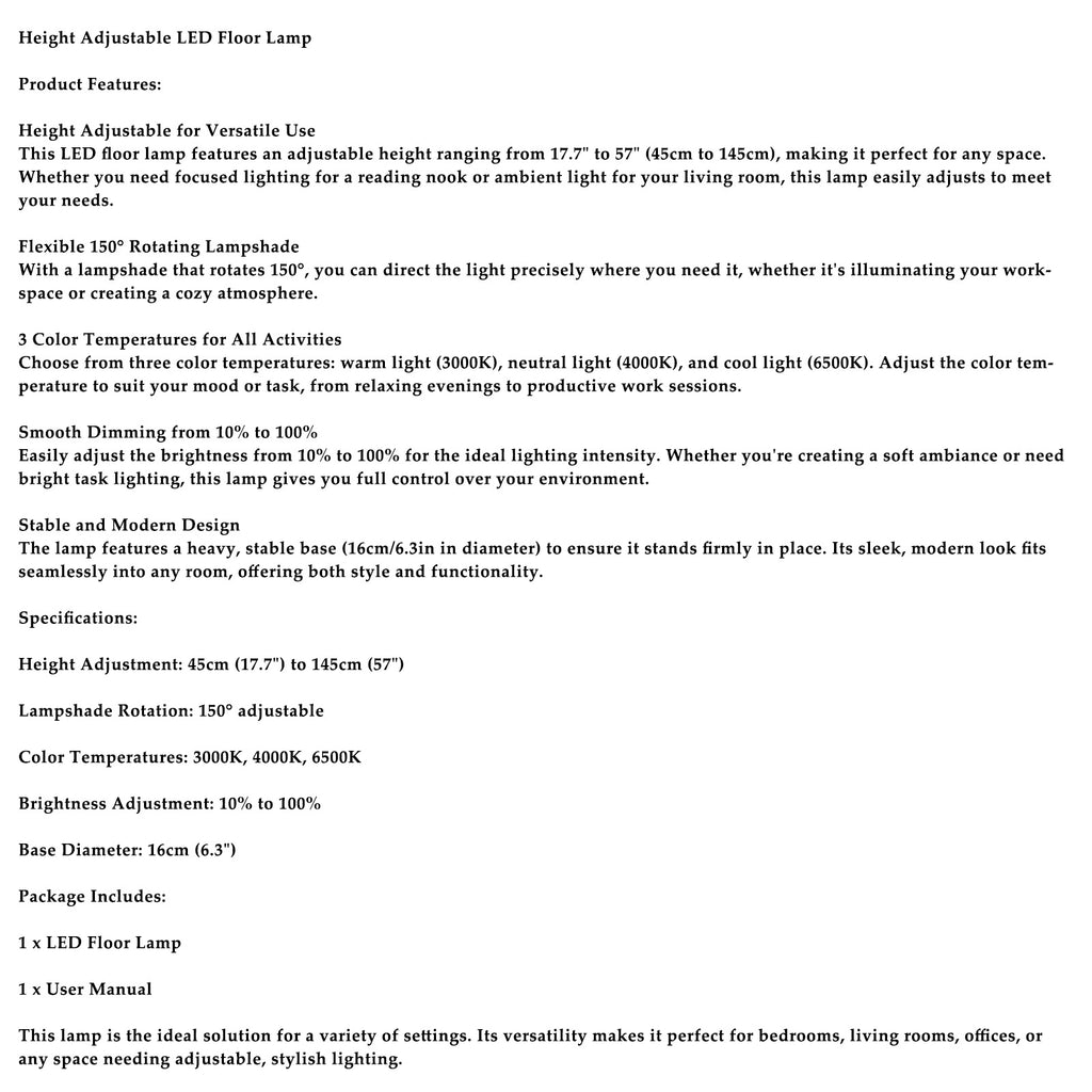 This LED floor lamp features an adjustable height ranging from 17.7" to 57" (45cm to 145cm), making it perfect for any space. Whether you need focused lighting for a reading nook or ambient light for your living room, this lamp easily adjusts to meet your needs.