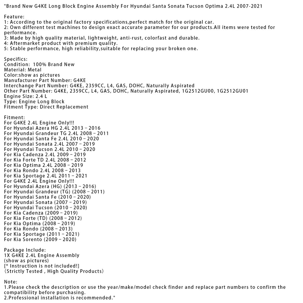 Bloc moteur long G4KE neuf pour Hyundai Santa Sonata Tucson Optima 2.4L 2007-2021