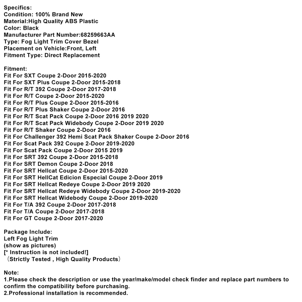 Garniture de feu antibrouillard avant gauche pour Dodge Challenger 2015-2021 68259663AA