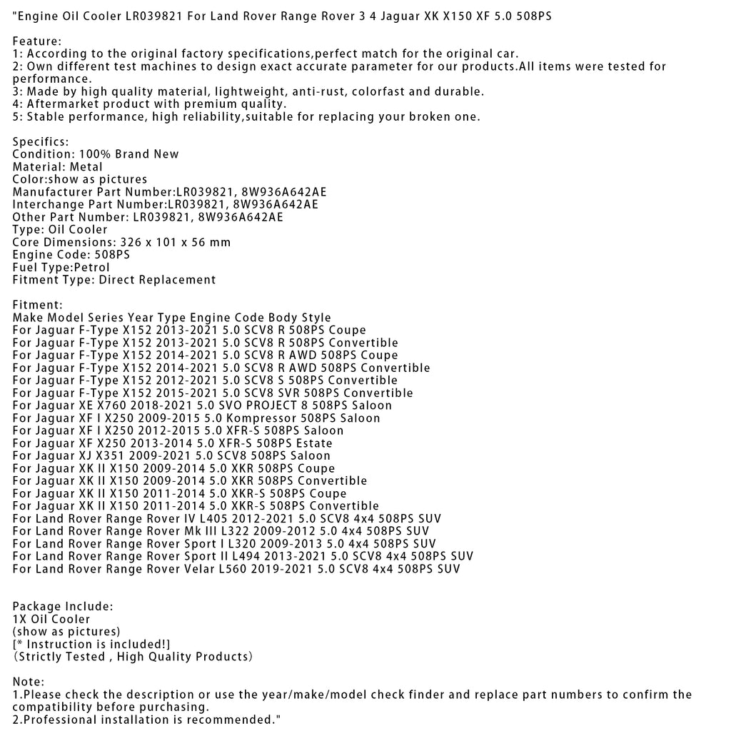 Refroidisseur d'huile moteur LR039821 pour Land Rover Range Rover 3 4 Jaguar XK X150 XF 5.0 508 ch