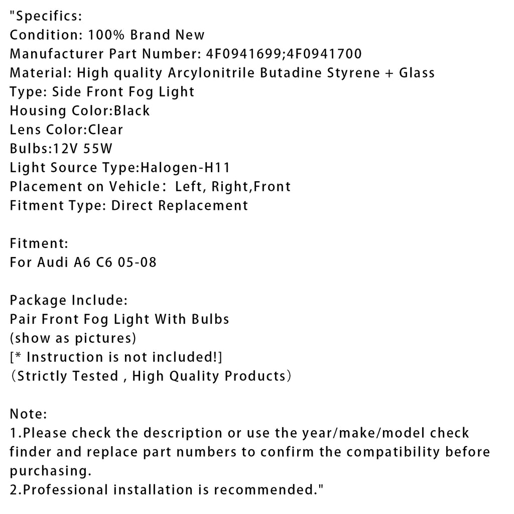 Paire de feux antibrouillard avant pour Audi A6 C6 2005 2006 2007 2008