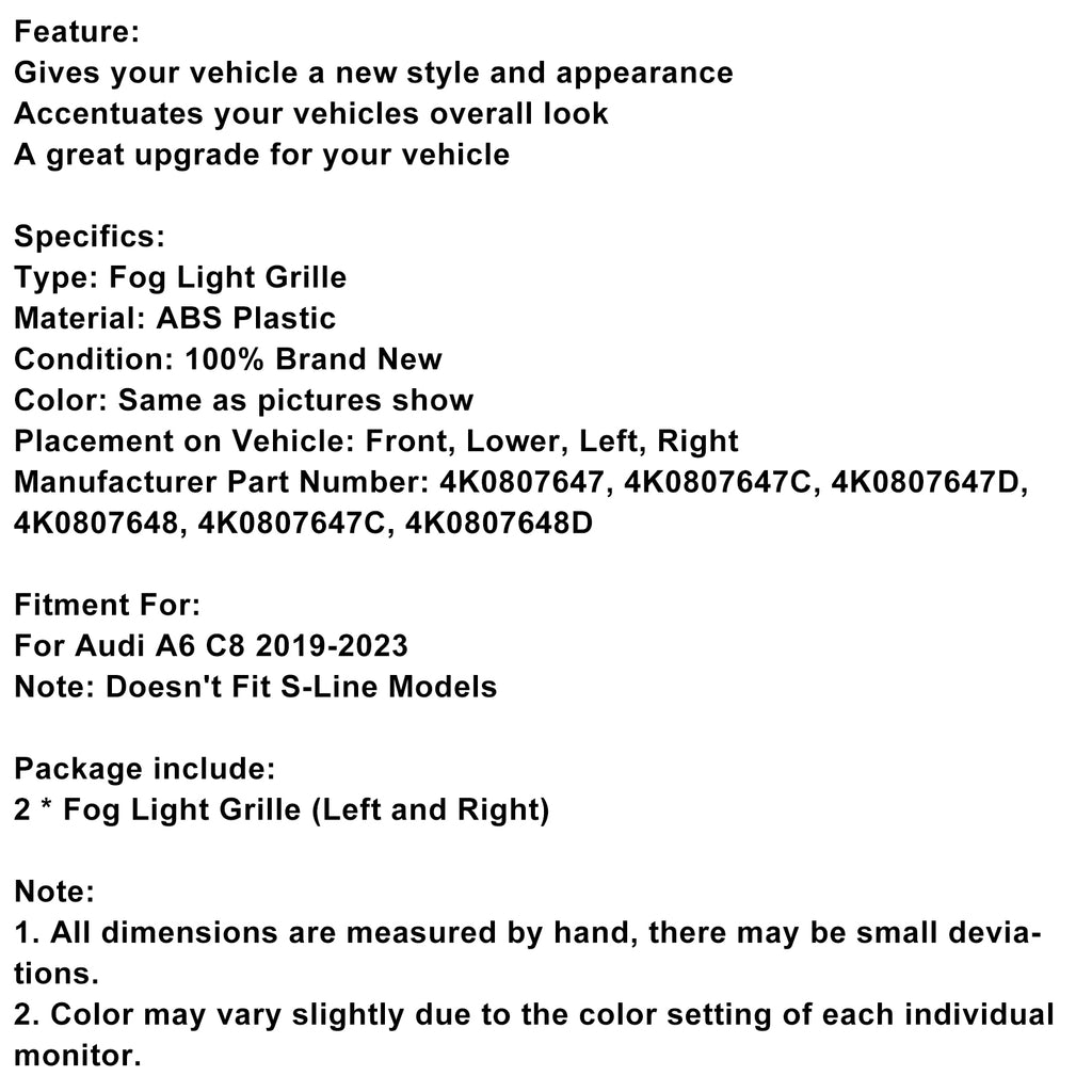 2 stuks voorbumper mistlampafdekking grille geschikt voor Audi A6 C8 2019-2023