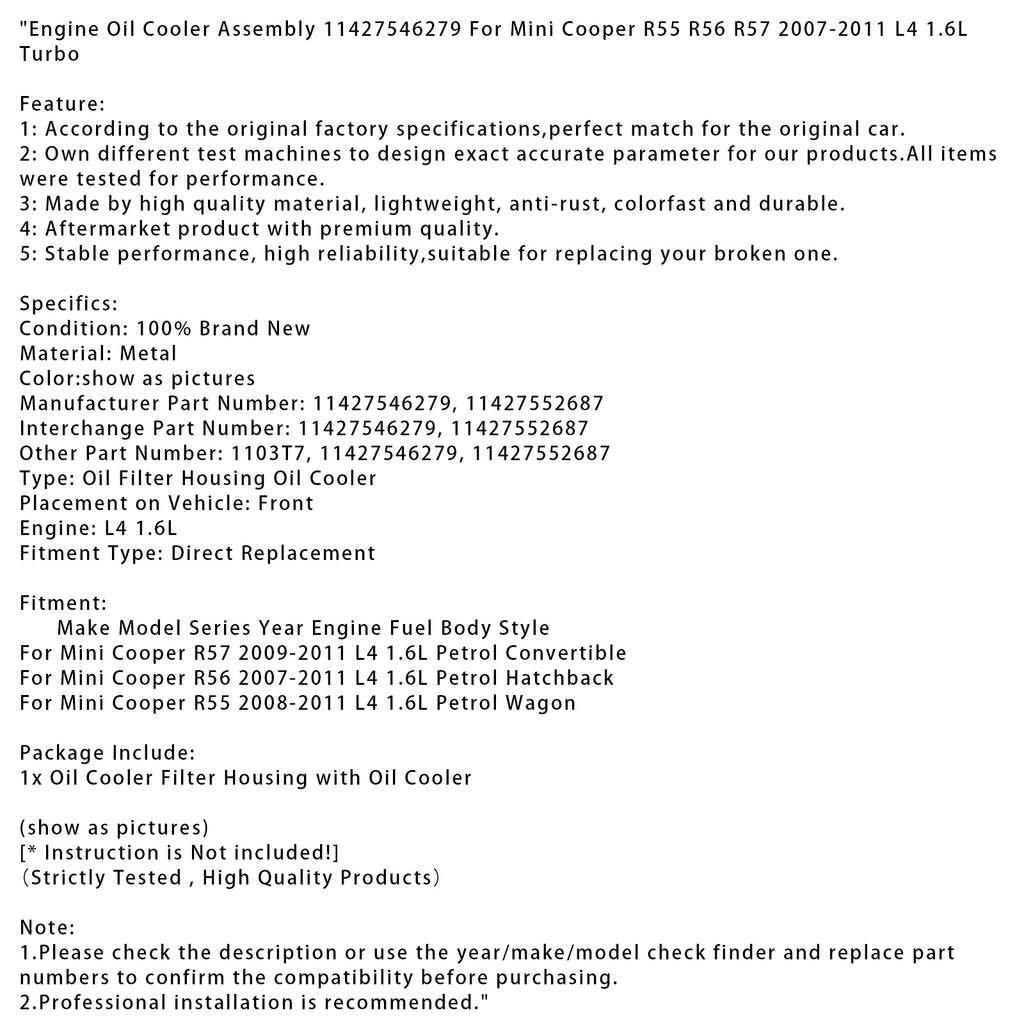 Motoroliekoeler assemblage 11427546279 voor Mini Cooper R55 R56 R57 2007-2011 L4 1.6L Turbo