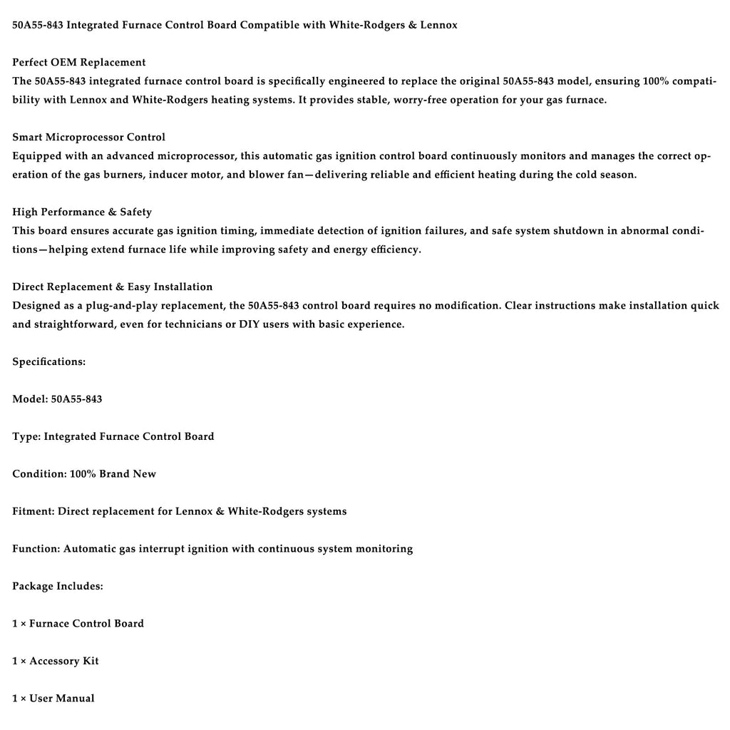 The 50A55-843 integrated furnace control board is specifically engineered to replace the original 50A55-843 model, ensuring 100% compatibility with Lennox and White-Rodgers heating systems. It provides stable, worry-free operation for your gas furnace.