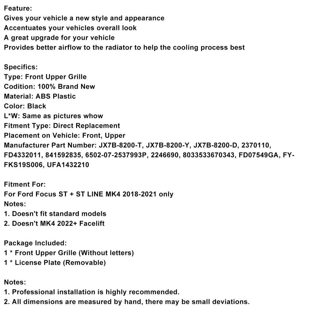 Gloss Black Front Bumper Grille Grill Fit for Ford Focus ST + ST Line MK4 2018-2021