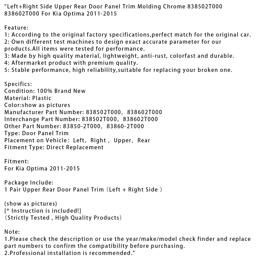 Linker- en rechterbovenpaneel van de achterdeur, sierlijst chroom 838502T000 838602T000 voor Kia Optima 2011-2015
